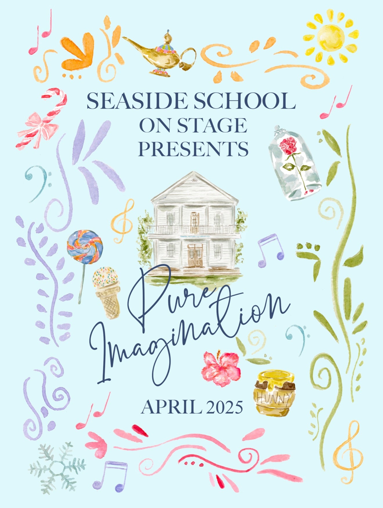 I designed The Seaside School's musical theatre program for their very first show, Pure Imagination! The program features custom watercolor illustrations that combine different elements of the show, capturing its whimsical and imaginative themes.